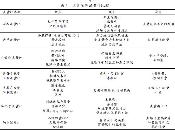 目前在工業(yè)上使用的流量計(jì)的類型非常多,其中適合蒸汽流量測(cè)量的流量計(jì)既有其優(yōu)點(diǎn),也有使用上的缺點(diǎn)。為確保蒸汽流量計(jì)的性能和精度,*重要的是選用的流量計(jì)要符合所使用的工況。表1對(duì)各類蒸汽流量計(jì)的優(yōu)缺點(diǎn)和應(yīng)用情況進(jìn)行了比較。