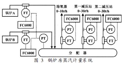 上海米其林輪胎公司新建兩臺(tái)35t/h鍋爐供3.9MPa飽和蒸汽。蒸汽流量使用渦街流量計(jì)測(cè)量,儀表配置如圖3所示。鍋爐投入運(yùn)行后,各路蒸汽分表的示值之和與總表經(jīng)平衡計(jì)算的差值≤1%R,發(fā)汽量與進(jìn)水量平衡測(cè)試結(jié)果也令人滿意。運(yùn)行三個(gè)星期后出現(xiàn)了新情況,即去除氧器的一套蒸汽渦街流量計(jì)示值有時(shí)會(huì)突然跳高,從而使分表之和比總表示值高約20%。