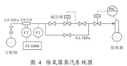 在現(xiàn)場(chǎng)了解情況時(shí),儀表人員觀察到了流量計(jì)示值突然跳高的現(xiàn)象。從記錄紙上可清楚看出,測(cè)量范圍為0~10t/h的除氧器耗汽流量,正常時(shí)在3t/h左右波動(dòng),*高時(shí)也未高于5t/h;但在異常情況發(fā)生后,流量示值突然跳到10t/h以上并長(zhǎng)時(shí)間維持此值。儀表人員立即到蒸汽分配器處觀察,發(fā)現(xiàn)去除氧器的一路蒸汽管有異常的振動(dòng),管內(nèi)壓力有周期性的小幅度擺動(dòng)。儀表人員又到除氧器處觀察,其蒸汽系統(tǒng)如圖4所示。
