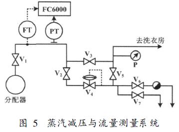 該實(shí)例發(fā)生在上海的一幢88層大廈。大廈所屬鍋爐房經(jīng)分配器向洗衣房供汽。因蒸汽壓力太高,所以中間設(shè)置了一個(gè)直接作用式減壓系統(tǒng)。減壓與流量測(cè)量系統(tǒng)如圖5所示。