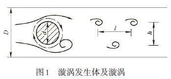 渦街流量計(jì)屬于速度式流量計(jì),是由漩渦發(fā)生體和頻率檢測(cè)器構(gòu)成的變送器、信號(hào)轉(zhuǎn)換器等環(huán)節(jié)組成。其測(cè)量原理是在流動(dòng)的流體中,若垂直流動(dòng)方向放置一個(gè)漩渦發(fā)生體,在某一雷諾數(shù)范圍內(nèi),將在漩渦發(fā)生體的后面的兩側(cè)交替產(chǎn)生有規(guī)律的漩渦(見(jiàn)圖1),旋渦列在旋渦發(fā)生體下游非對(duì)稱(chēng)地排列。