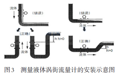 測(cè)量液體時(shí)為保證測(cè)量精確,渦街流量計(jì)的管道必須充滿(mǎn)液體。渦街流量計(jì)安裝在水平管道上時(shí),應(yīng)將下游段的管道高于渦街流量計(jì),以保持滿(mǎn)管;當(dāng)流體向下流動(dòng)時(shí),應(yīng)將下游段的管道高于渦街流量計(jì),以保持滿(mǎn)管。流量計(jì)安裝在垂直管道上時(shí),流體應(yīng)該向上流動(dòng),當(dāng)流體向下流動(dòng)時(shí),應(yīng)將下游段的管道高于渦街流量計(jì),以保持滿(mǎn)管,如圖3所示。