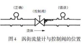 控制閥應(yīng)安裝在渦街流量計(jì)的下游,這樣可解決液體流過(guò)控制閥時(shí),因壓力下降而產(chǎn)生氣泡的不良影響,見(jiàn)圖4。渦街流量計(jì)安裝于水平管道時(shí),當(dāng)被測(cè)介質(zhì)溫度大于200℃時(shí),變送器一定要表頭向下安裝。