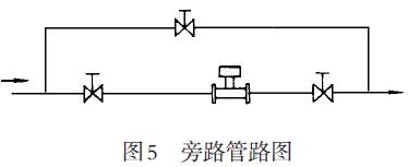 為了方便地檢查和清洗流量計(jì)(漩渦發(fā)生體),安裝如圖5所示的旁通管道。對(duì)于初次投運(yùn)或管線設(shè)備檢修后,開(kāi)車(chē)時(shí)應(yīng)先使工藝介質(zhì)走旁路24小時(shí),待介質(zhì)干凈時(shí)開(kāi)表,以防變送器被異物阻塞或變送探測(cè)器被損壞。