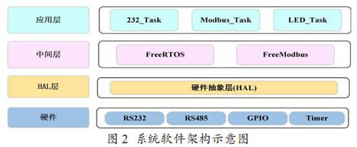 Modbus 通訊模塊的軟件架構(gòu)如圖 2 所示,分為硬件層、硬件抽象層,中間層和應用層。中間層包括一個實時操作系統(tǒng)FreeRTOS 和一個針對嵌入式環(huán)境開發(fā)的輕量級 Modbus 協(xié)議庫Freemodbus。在應用層,主要創(chuàng)建了三個任務,232_Task 負責讀 取和解析流量計表頭輸出的文本信息,Modbus_Task 負責存儲 解析后的流量計數(shù)據(jù)到 Modbus 寄存器表,以及以 Modbus 協(xié)議與取水監(jiān)測設備通信,LED_Task 是一個輔助任務,主要用來提示程序運行狀態(tài)。