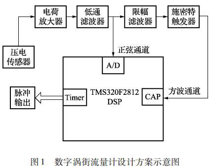 本文設(shè)計(jì)的基于 TMS320F2812 DSP 的數(shù)字管道壓縮空氣流量計(jì)的信號(hào)處理系統(tǒng)由前置放大電路和數(shù)字信號(hào)處理電路兩部分組成。本文選用的前置放大電路即為目前被廣泛應(yīng)用的普通管道壓縮空氣流量計(jì)的前置放大電路,主要由電荷放大電路、低通濾波電路、限幅濾波電路和施密特觸發(fā)電路組成; 對(duì)于經(jīng)壓電傳感器測(cè)得的渦街信號(hào)采用了頻域分析和時(shí)域分析相結(jié)合的方式,即由前置放大電路和數(shù)字信號(hào)處理電路相配合。時(shí)域分析通道利用 DSP 事件管理器的捕獲模塊,對(duì)前置放大電路輸出的方波進(jìn)行頻率計(jì)算,然后再由 DSP 事件管理器通用定時(shí)器的比較輸出模塊進(jìn)行脈沖輸出。頻域分析通道即 DSP對(duì)低通濾波電路輸出的疊加了許多噪聲的正弦信號(hào)進(jìn)行 A/D 采樣,再利用 DSP 對(duì) A/D 采樣的結(jié)果進(jìn)行頻譜分析,從而得出此時(shí)渦街信號(hào)的頻率,*后由 DSP 通用定時(shí)器的比較輸出模塊進(jìn)行脈沖輸出。系統(tǒng)設(shè)計(jì)方案示意圖如圖 1 所示。