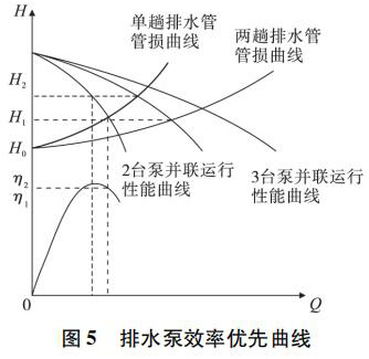 當(dāng)執(zhí)行多臺排水泵同時(shí)運(yùn)行時(shí),通過排水泵特性曲線與管路特性曲線的比較,選擇非常好的匹配排水泵與排水管數(shù)量,保證排水泵在非常好的新效率點(diǎn)運(yùn)行。如圖 5 所示。