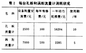 由表2可知,渦街流量計(jì)的壽命較低而設(shè)備購(gòu)置和維修費(fèi)又偏高。但因動(dòng)力耗損費(fèi)大大低于孔板流量計(jì),其節(jié)約潛力仍相當(dāng)可觀。