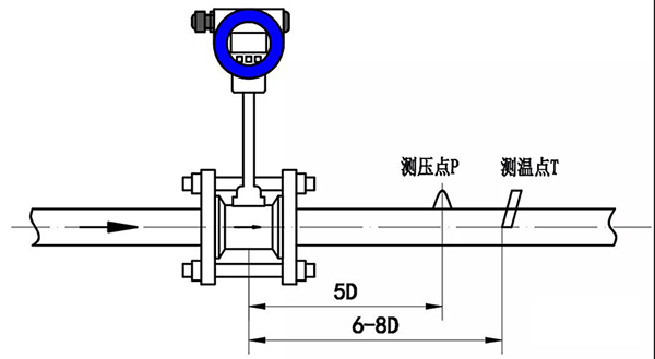 注:測壓孔和測溫孔的安裝設(shè)計。被測管道需要安裝溫度和壓力變送器時,測壓孔應設(shè)置在下游3-5D處,測溫孔應設(shè)置在下游6-8D處。