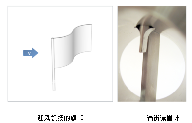 自然界的很多現(xiàn)象都源于渦街原理,比如迎風飄揚的旗幟,旗桿作為漩渦發(fā)生體, 當風從旗桿一側(cè)吹來時,旗桿阻擋了風,分別從旗桿兩側(cè)吹過的氣流在其后形成了漩渦,因此,旗幟能夠隨風飄揚。在渦街流量計中,正是采用了“卡門渦街原理”,測量管中有一個漩渦發(fā)生體,漩渦的脫落頻率正比于流量,漩渦脫落頻率通過傳感器中的壓電晶體來測量,公式如下: