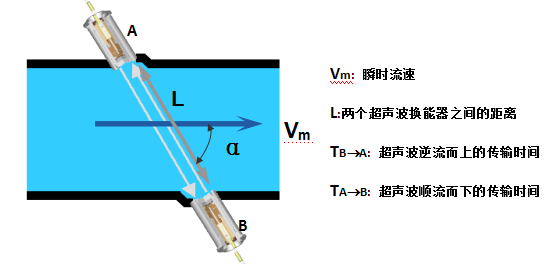 相比前兩種測量原理,超聲波時差法的原理則更加簡單易懂一些。與人們劃船或者游泳類似,超聲波在流動的流體中的傳播速度與流體的流速有關。順流而下的超聲波的傳播速度大于逆流而上的傳播速度。只要分別測量出超聲波順流和逆流的傳播時間,就可以依據(jù)下面的公式得到該路徑上瞬時流速。這樣,介質(zhì)流量則可以通過流速、管道截面積等求得。