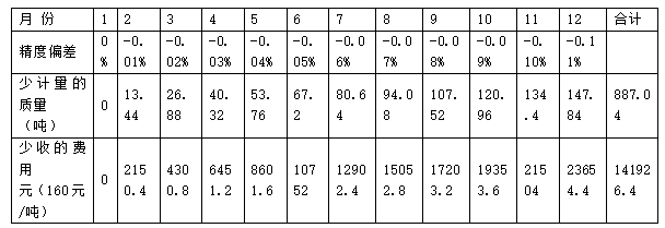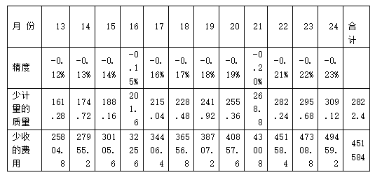 為了簡化計算,假設每個月孔板流量計因為磨損而產(chǎn)生的精度變化是線性的,每月精度下降0.01%,那么通過下表可以看出,*一年內(nèi)損失的收益:
