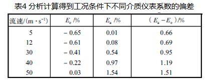 在表2所列的測(cè)試條件下,水中的儀表系數(shù)不受3個(gè)因素的影響可認(rèn)為是定值,黏度的影響可忽略,計(jì)算在不同流速下,綜合因素影響,引起的儀表系數(shù)偏差Ee和Ea及空氣和蒸汽之間的偏差Ea-Ee如表4所示。