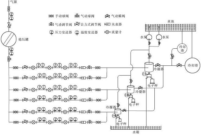 本研究所采用的實(shí)驗(yàn)裝置分別為冷凝稱重法蒸汽流量計(jì)量標(biāo)準(zhǔn)裝置、負(fù)壓法音速噴嘴氣體流量計(jì)量標(biāo)準(zhǔn)裝置、質(zhì)量法水流量計(jì)量標(biāo)準(zhǔn)裝置。其中冷凝稱重法蒸汽流量計(jì)量標(biāo)準(zhǔn)裝置是國(guó)內(nèi)**采用蒸汽實(shí)流標(biāo)定的流量標(biāo)準(zhǔn)裝置,擴(kuò)展不確定度為0.1%(k=2),檢定流量范圍為0.01~10t/h,其工作原理如圖2所示,以過熱蒸汽作為檢定介質(zhì),將通過蒸汽流量?jī)x表的蒸汽進(jìn)行冷凝稱重的原理,對(duì)蒸汽流量?jī)x表進(jìn)行實(shí)流標(biāo)定。氣體裝置為負(fù)壓法音速噴嘴氣體流量計(jì)量標(biāo)準(zhǔn)裝置,擴(kuò)展不確定度為0.25%(k=2),檢定流量范圍為2.5~10000m3/h。水裝置為質(zhì)量法水流量計(jì)量標(biāo)準(zhǔn)裝置,擴(kuò)展不確定度為0.05%(k=2),檢定流量范圍為0.05~200m3/h。