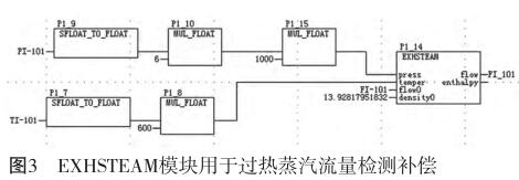 其中COMPENSATE模塊適用于溫度為260~800℃,壓力(絕壓)為0.5~32MPa的工況;而EXHSTEAM模塊適用于溫度為140~560℃,壓力(表壓)為98.6777~15898.6777kPa的工況。假設(shè)過(guò)熱蒸汽的設(shè)計(jì)壓力為4MPa(表壓),設(shè)計(jì)溫度為400℃;過(guò)熱蒸汽的實(shí)測(cè)壓力為PI-101:0~6MPa(表壓),實(shí)測(cè)溫度為TI-101:0~600℃,流量為FI-101,補(bǔ)償后的流量為FI_101,經(jīng)EXHSTEAM過(guò)熱蒸汽特性計(jì)算得出設(shè)計(jì)密度為13.92817951832kg/m³,則DCS圖形化編程如圖3所示。